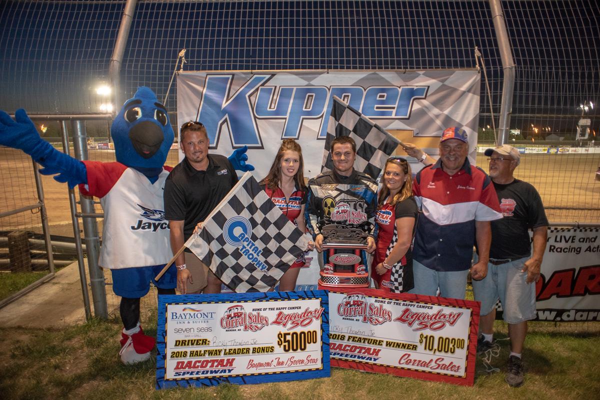 After six straight days of racing across North Dakota and Canada, 74 drivers had a chance to drive home with $10,003. After winning his heat race, Eddie Belec of Arvada, Colorado started on the pole for the 50 lap feature. When the green flag waved, 33 cars raced three wide into corner one. Outside pole sitter Shawn Strand grabbed the lead but felt pressure from behind from Jason Wolla. An early caution regrouped the field and on the restart, Wolla took over the top spot from Strand. It quickly became a three car battle for the second position between Strand, RC Whitwell and Casey Arneson. Hugging the guardrail, Arneson shuffled into the second position. As Whitwell and Strand continued to race for third, defending Legendary 50 winner, Ricky Thornton Jr started to reel in the two drivers. Thornton picked off off Whitwell for fourth and then Strand for third. Continuing his march to the front, Thornton passed Arneson for second before a caution for a slow Jeff Taylor regrouped the field. On the restart, Thornton passed Wolla for the lead just before the caution for the mandatory pit stop halted the field on the front stretch. Pit crews had five minutes to make any changes needed with the exception of changing tires. When the green flag waved again, Thornton pulled away as DCMT Champion, Hunter Marriott passed Whitwell for fourth. The yellow flag would wave again with 23 laps to go for the spun car of Josh Rogotzke. On the restart, Wolla dove low under Thornton Jr while Marriott passed Arneson for third. Thornton had his hands full with a strong Wolla. They raced door to door for many laps, flip flopping position which allowed Marriott to close in on the leaders. Thornton started extend his lead when Marriott started to challenge Wolla for second. As Wolla and Marriott raced side by side, Thornton started to catch lapped traffic. Just laps before the checkered flag, Thornton found himself in the middle of thick lapped traffic which allowed Wolla and Marriott to close in a hurry. Unfortunately, they ran out of time as Ricky Thornton Jr cruised to victory lane and instantly became $10,003 richer. Jason Wolla held off Hunter Marriott for second while Fargo, North Dakota's Casey Arneson finished fourth ahead of Tim Ward.