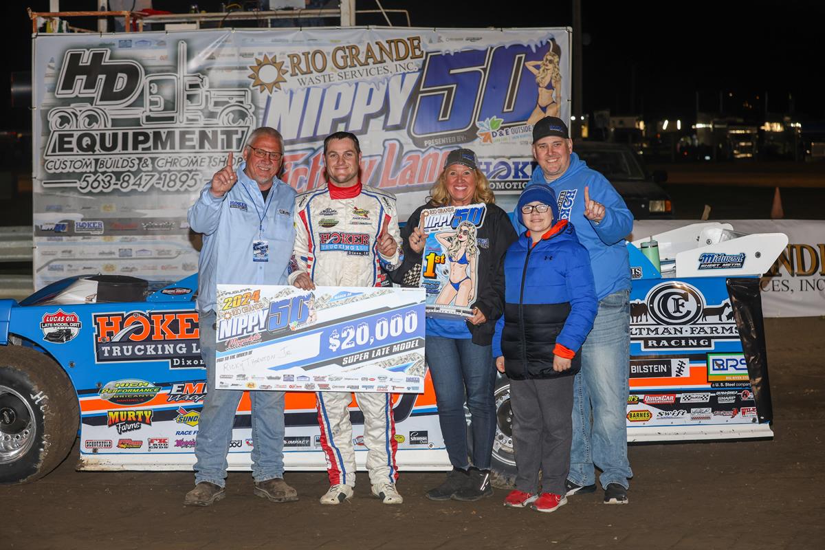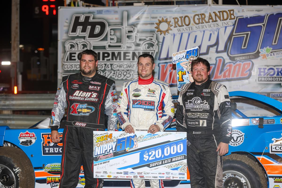 Ricky Thornton Jr. pushed his 2024-win total to six on Saturday night with a $20,000 triumph in his SSI Motorsports / Coltman Farms / Hoker Trucking No. 20RT Dyno One Inc. / Excel Floor Covering / Sub-Surface of Indiana / Longhorn Chassis / Clements Racing Engine Super Late Model during the finale of the inaugural Rio Grande Waste Services Nippy 50 presented by D&E Outside Services.